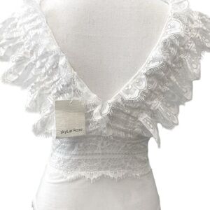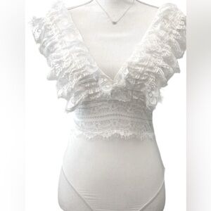 NWT.Medium. Elegant Ivory lace bodysuit with ruffle details. Perfect for a chic look.100% polyester.
