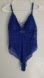 Elegant blue lace bodysuit with delicate straps and intricate detailing.