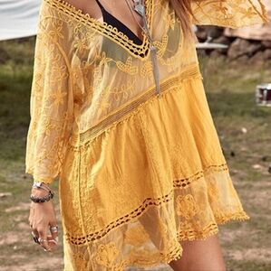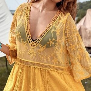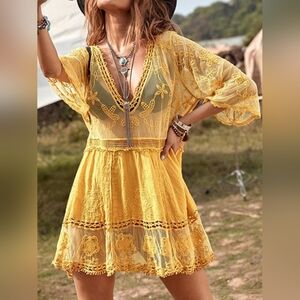 Lace Bohemian Oversized Swim Coverup Mini Dress Half-Sleeve Swimwear Sheer Cover
