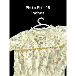 The top is made from lightweight fabric and has delicate accents of ruffles, making it a stylish addition to any wardrobe. It comes in a size medium and is a regular fit. The blouse has a feminine and flowy style that is perfect for any occasion.