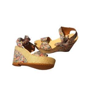 Lace Bow Knot Fashion Flower Print Ankle Tie Wedge Heels