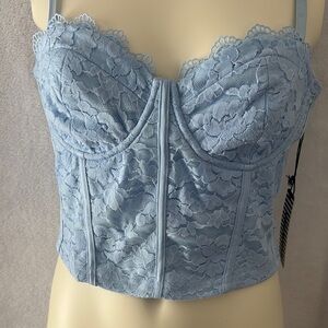 Elegant lace bustier top in a soft light blue shade. Perfect for adding a touch of sophistication to your intimate wear collection.