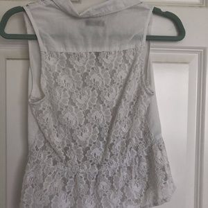 A sleeveless button-up blouse with a lace back. Worn a few times but in good condition. Mildly altered (front was stitched together to prevent buttons from gaping, top buttons left open so it can be easily pulled over the head) but can be reversed upon request.