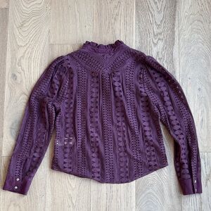 Chic lace blouse with button-up front and a bit of puff sleeve. Rich plum color. Perfect for any occasion. Runs small; has a bit of stretch; no lining.
