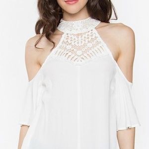 Cold shoulder top with crochet detail at the top. Back button closure at neck.