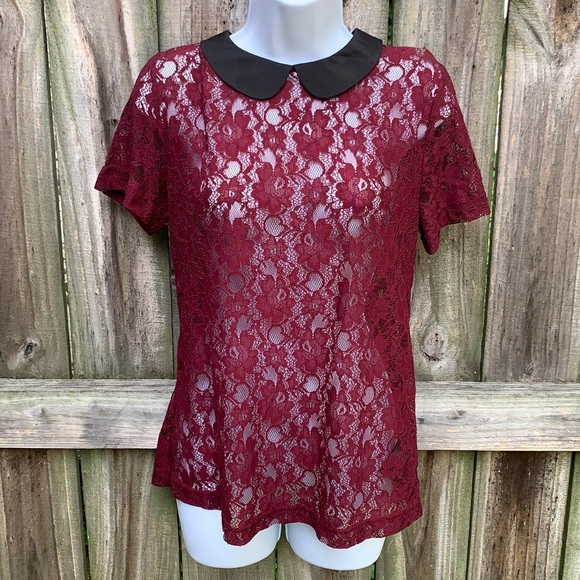 Lace shirt with black Peter Pan collar. Buttons down back of shirt. Wine color.