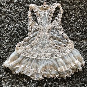 Lace crochet racer back tiered tank. Could be used as bathing suit cover as it is see through. Very cute and in very good condition, no flaws