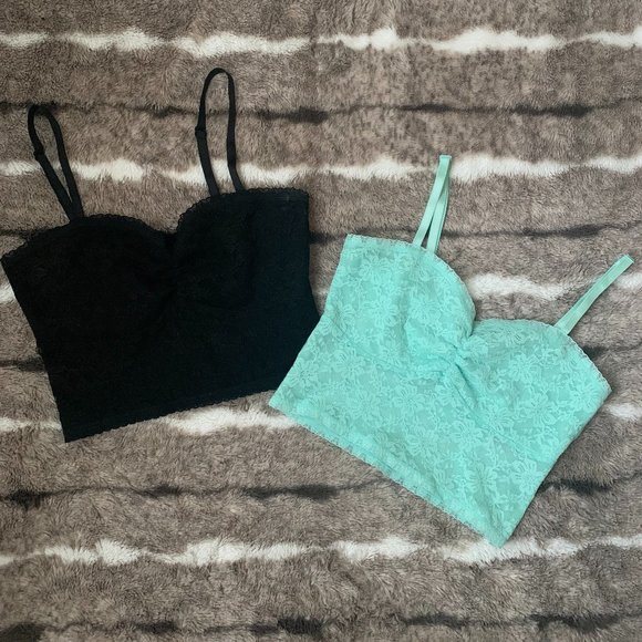 This is a bundle, but am willing to sell them separately for a reasonable offer. Can be worn as a crop top or a bralette. Has adjustable straps, a sweetheart lace line, and ruching in the front. Each have been worn only once. In great condition. Message me with any questions.