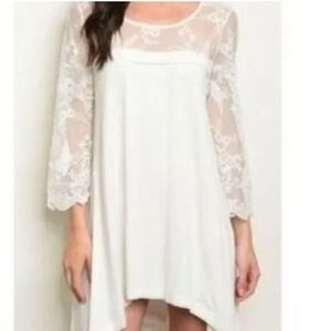 Lace Detail Tunic. Beautiful lace with flowy body and 3/4 length sleeves featuring asymmetrical hemline.