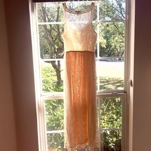 Cream lace dress with a sheer back and bottom hem. Cinched waist. Lattice work in the collar and straps.