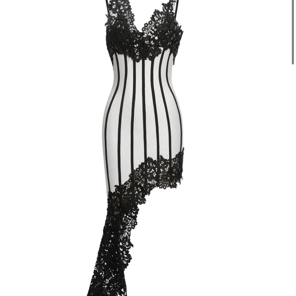 Turn heads with this chic asymmetrical black lace dress. Perfect for evening events, its unique design adds a touch of elegance to your wardrobe. Chic Asymmetrical Black Lace Dress