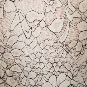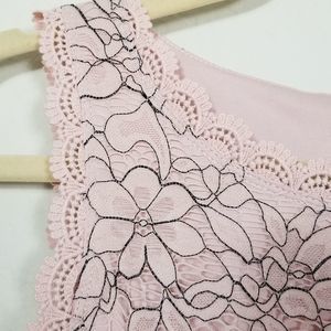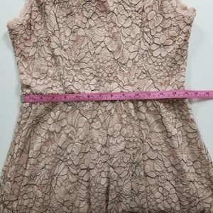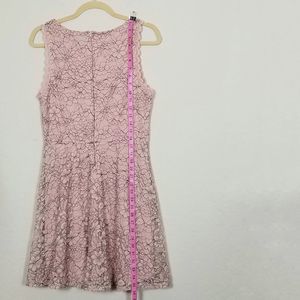 Lovely lace Fit and Flare/Skater Dress from LILY ROSE. Scalloped edges around neckline and sleeves. Icey Pink with grey outline around the floral lace detailing, fully lined, back zip. EUC see pics for measurements.