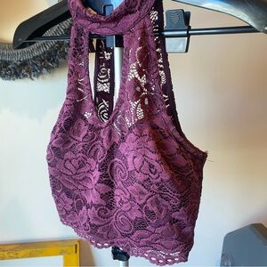 Stylish lace halter crop top in a rich burgundy color. Perfect for layering or wearing alone.