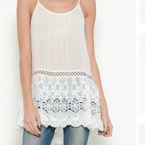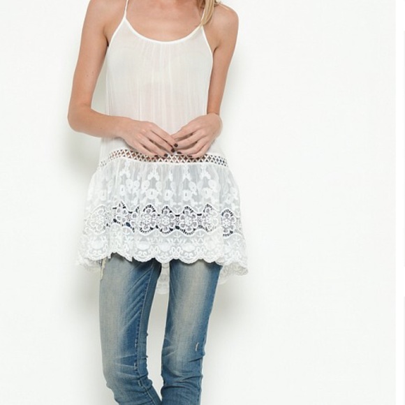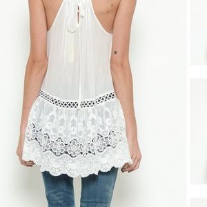 This sleeveless top is so versatile. Layer it under a slightly cropped top to give a chic effect or wear it alone. It features a contrasting bottom hem lace, and a neckline that will adjust when tied in the back. So adorable with jeans!!! See last picture for measurements