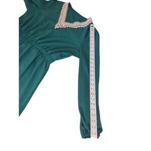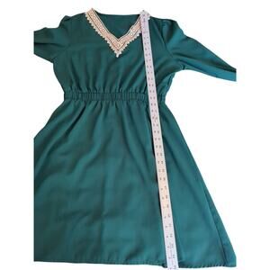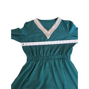 Elegant knee-length dress with a classic fit and flare style. The dress features a beautiful green color and a puff sleeve design with a flattering V-neckline. The elastic waist and swing A-line silhouette make it perfect for any occasion, whether it's for travel, weddings, parties, cocktail events, casual outings, or workwear. The dress is made of polyester and rayon fabric, which is machine washable for easy care.
