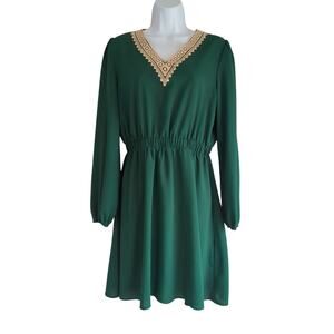 Lace Long Sleeve V Neck Short Dress Elastic Waist Swing A-Line Dress
