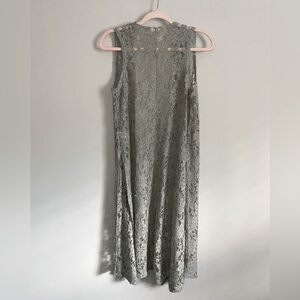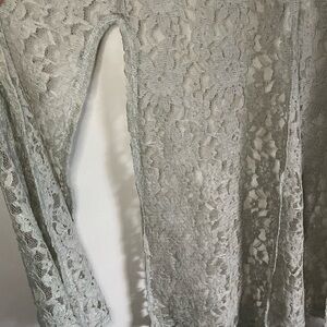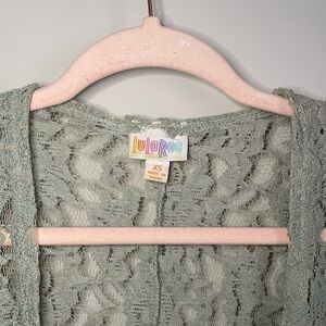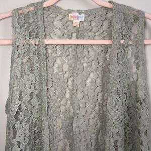 This floral Lularoe Joy longline vest is so cute! It is perfect to go over any outfit, and really looks great over dresses. It’s a soft sage to soft mint lace.