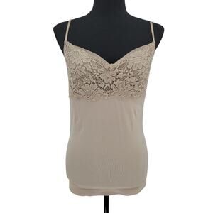 Beige camisole with floral lace & mesh bust and adjustable straps. Stretchy, lightweight, and ideal for layering. A closet staple and core part of any capsule wardrobe.