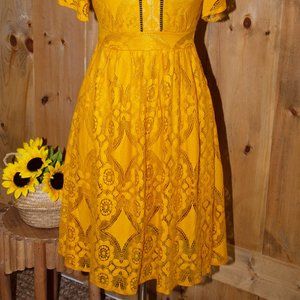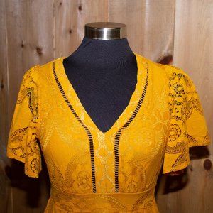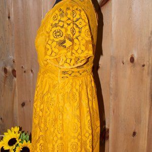 Featuring midi length, v-neck, and lace details (bodice is sheer, skirt part is lined).