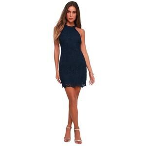 A lively pattern of non-stretch crochet floral lace creates an eye-catching overlay atop knit fabric lining. Halter neckline and darted sleeveless bodice transition into a chic, sheath skirt with a mini. Hidden back zipper with clasp.