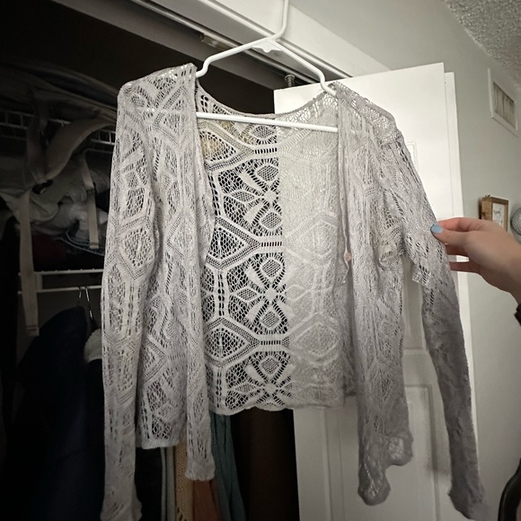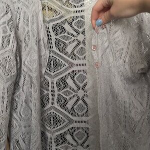 Elegant lace open-front cardigan in a light gray shade. Perfect for layering.