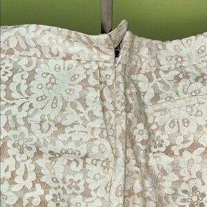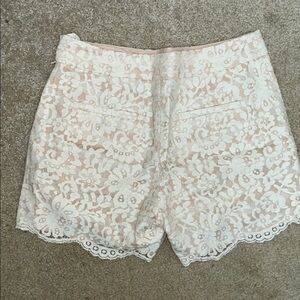 Elegant lace overlay shorts in cream and pink. Perfect for a chic look.