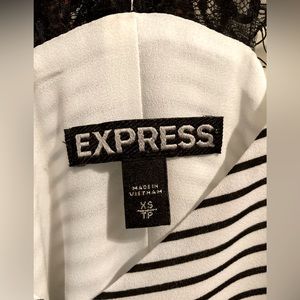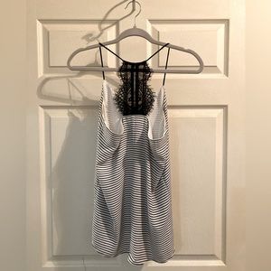 Black and white striped lace racerback cami. It is polyester, so it holds up well and is very flattering. Great length for someone tall or with a long torso.