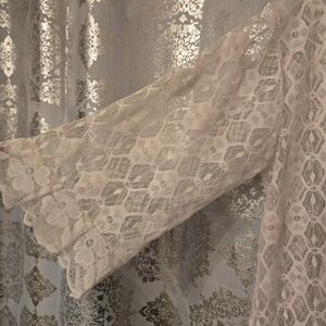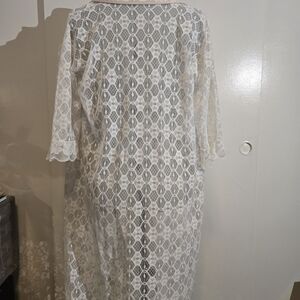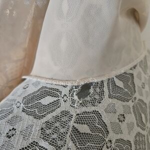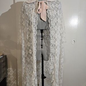 Saved from a dusty vintage thrift shop garage. No label. Unlined lace robe featuring scalloped edges, soft pink bow, and Peter Pan collar. The bow's pink color has transferred to some parts of the lace robe. There is a small rip (see pic) under the collar's right side. Full length is 42" (measured from the top of the back).
