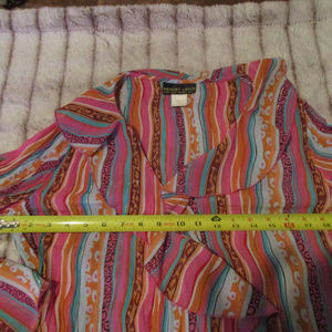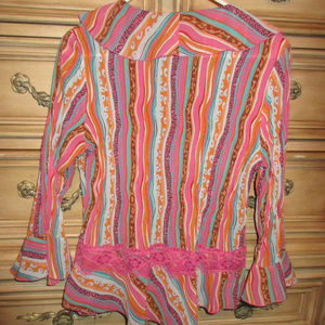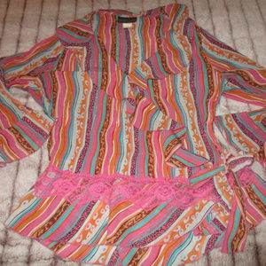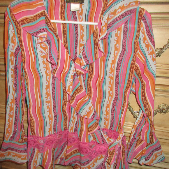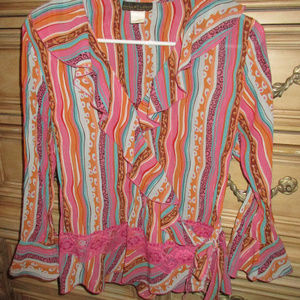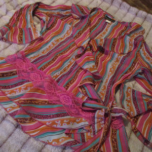 Bright multi color Shirt with lace trim & ruffles wrap which ties on the side.