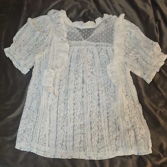 Elegant lace blouse with ruffle details. Features a delicate polka dot and floral pattern.
