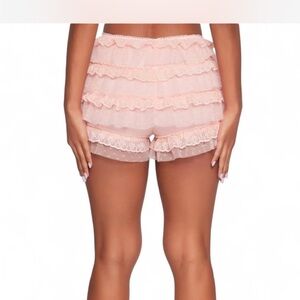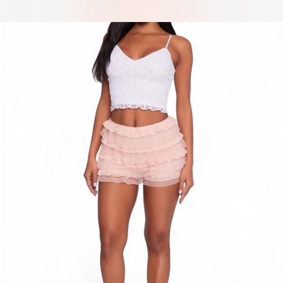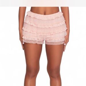 Blush pink tiered ruffle lace shorts. Feminine and flirty look.