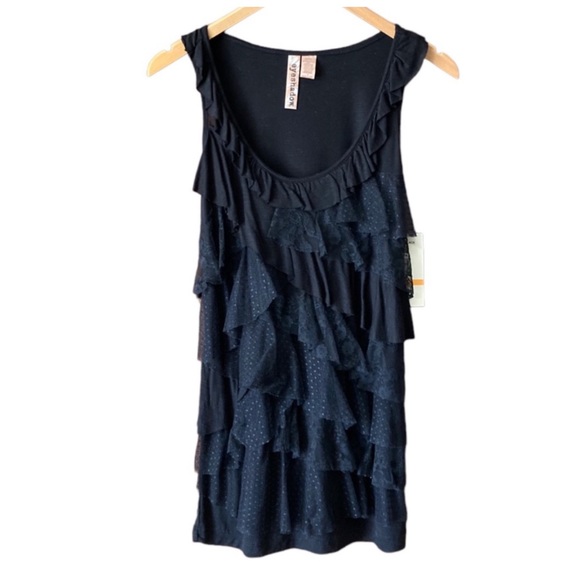 In perfect condition. NWT. Black sleeveless lace ruffle top. Plain back. There is some stretch to the jersey material. The neckline is kind of low. Can wear with cami.