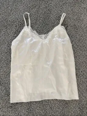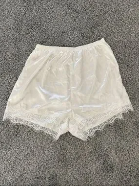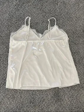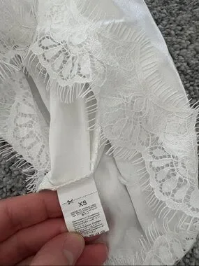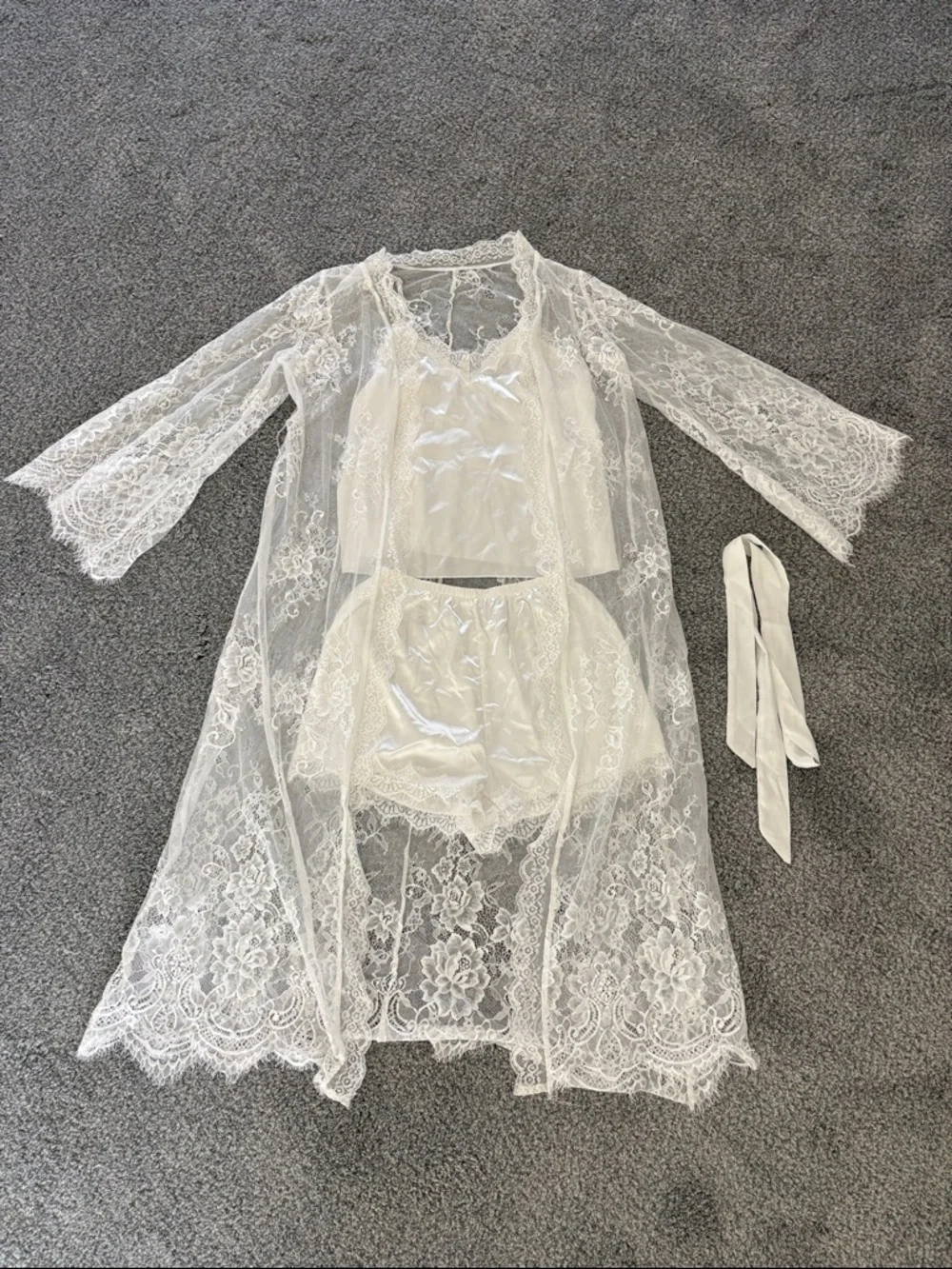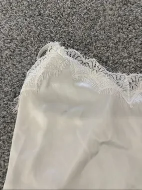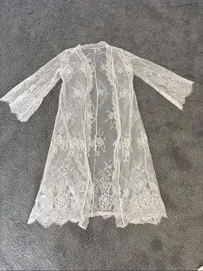 Elegant white sheer lace robe with floral embroidery. Includes matching white silk slip camisole and shorts. Pajama set. The straps adjust on the tank. This is all in great condition although there is a very tiny faint stain on the front of the tank as shown. Perfect for getting ready for a wedding, rehearsal dinner, or bridal shower.