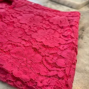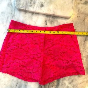 Lace shorts, hot pink, pockets in front and faux pockets in back, zip up / clasp closures. Hot pink lining, no stains, no ware, no fraying! Size 6. Dress up with a blazer or dress down with a cute body suit!