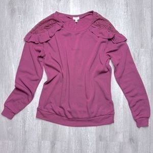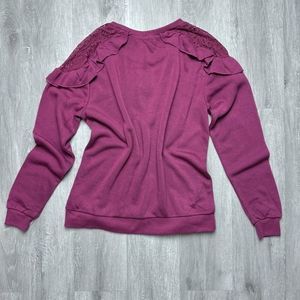 Size S maroon pullover with lace shoulders and ruffle accent. New with tags. Chest 19in. Length 24in.