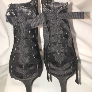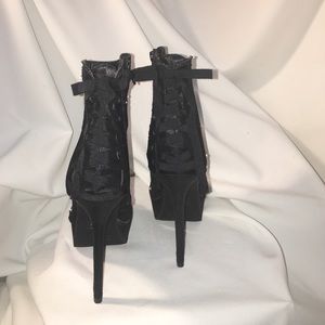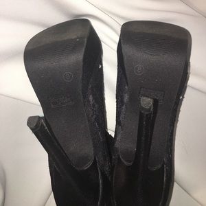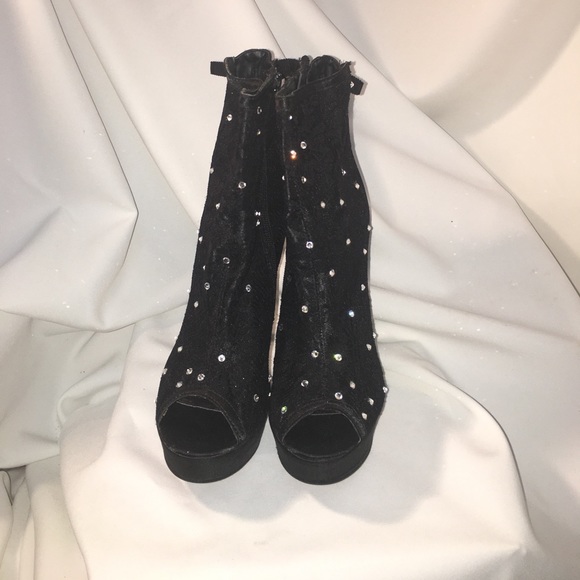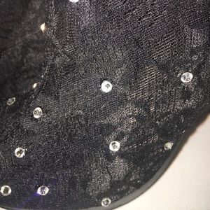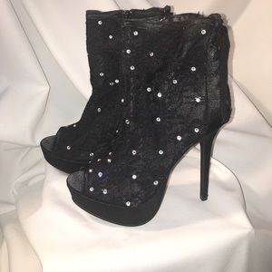 Hand embellished Lace and Satin Swarovski crystal corset tie back peep toe stiletto platform booties