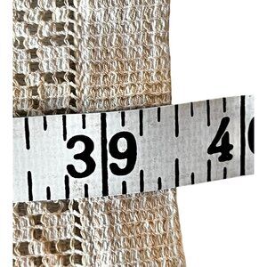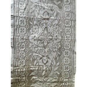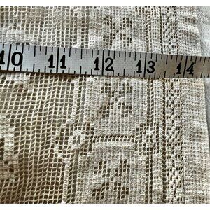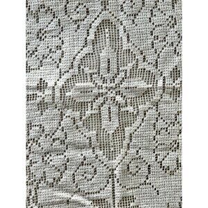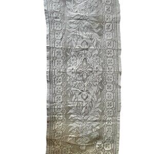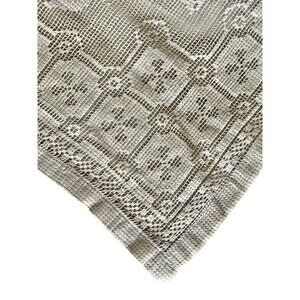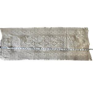 This vintage lace table runner features an intricate floral and geometric pattern in a creamy beige color. Measuring 39.5” x 14.5”, it adds an elegant touch to your dining setup, enhancing the aesthetics of any table arrangement with its sophisticated design and timeless appeal.