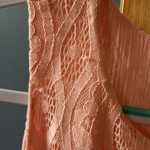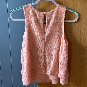 Pretty pink lace tank top! In great condition! A few spots where lace is snagged (pictures 4&5). Has keyhole back and pink lining.