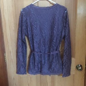 Beautiful lace long-sleeve top with lace/mesh sleeves and ribbon waist belt. Deep v-neck. Fits true to size but has minimal stretch especially in sleeves. A deep grey-hue purple, the photo makes it look more blue.