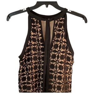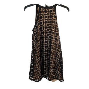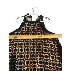 Chelsea28 black shift dress with geometric lace. Beautiful classic lace overlays a nude swingy shift silhouette. Halter neck with tie at back. Fully lined mini dress hits above the knee. Make this versatile a piece in your fall and winter wardrobe! Women’s size small. See photos for measurements.