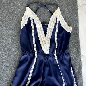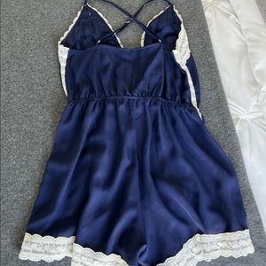 Stunning navy blue sleeveless romper with crisscross straps, and white lace trim. Bust 32-34”, Hip 36", Full length 28".