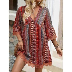 Lace Trim Printed V-Neck 3/4 Sleeve Dress