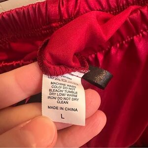 Elegant red robe and matching shorts with black lace trim. Soft, silky fabric for comfortable wear. Flattering, feminine silhouette with delicate lace accents. Perfect for lounging or sleepwear in vibrant red.
