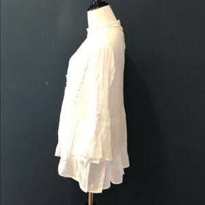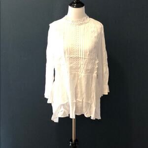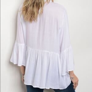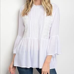 Long bell sleeve lace trim babydoll top. Double button keyhole back detail. 100% rayon. Unlined, may require shapewear.