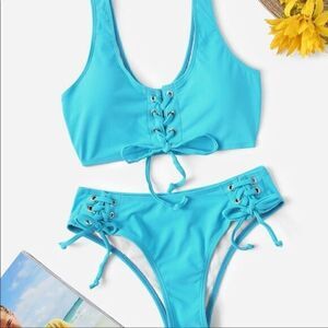 Lace Up Bikini. Removable padding in bra and fully lined. Pics on mannequin and with measuring tape are size S.