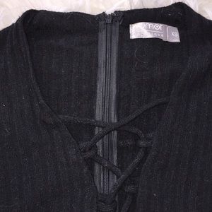 LF fall '15 long sleeve lace up bodysuit with buttons at the crotch and zips up on back. It's stretchy sweater material. Can fit XS or S.