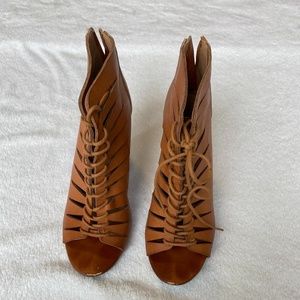 Brown Lace Up Heeled Booties with Cutouts. Laces tie at the front/top. Used - slightly scuffed.