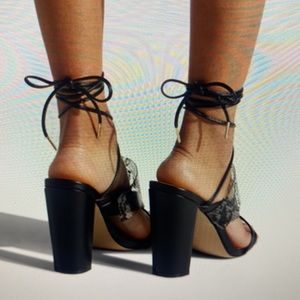 A strappy high block-heeled sandal with adjustable laces.