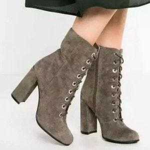 Smoky grey suede Teisha Boots by Vince Camuto. Genuine suede with covered block heel, full lace up and full zip for easy on and off. This retro style boot has such versatile style with subtle nods to everything from prairie and western to witchy or victorian. Charcoal gray is a great neutral - wear with office / professional looks, streetwear, everyday styles or dress them up.