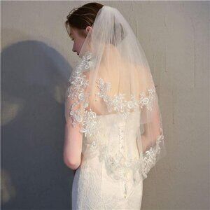 Lace Veil Short Waist Veils 2 Tier Soft Tulle Veils Bridal Veils with Comb(Ivory